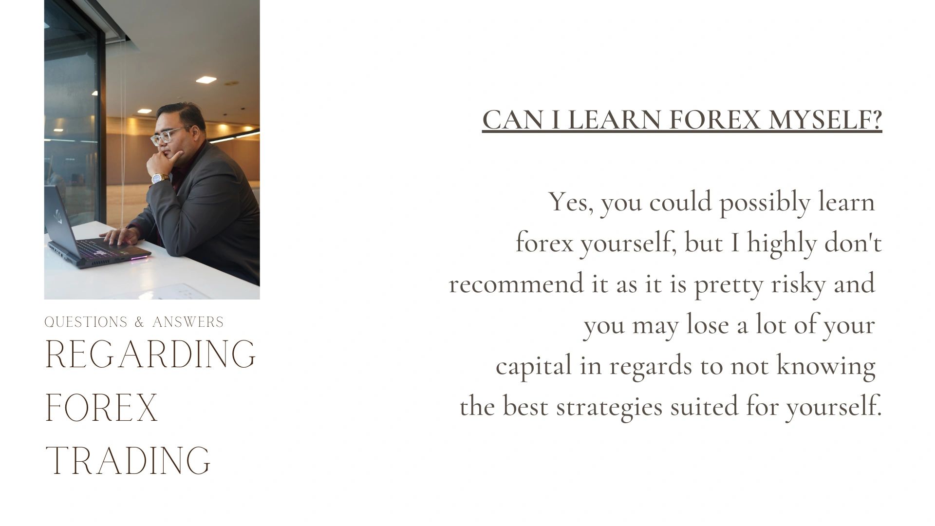 Yes, you could possibly learn forex yourself, but I highly don't recommend it as it is pretty risky and you may lose a lot of your capital in regards to not knowing the best strategies suited for yourself.